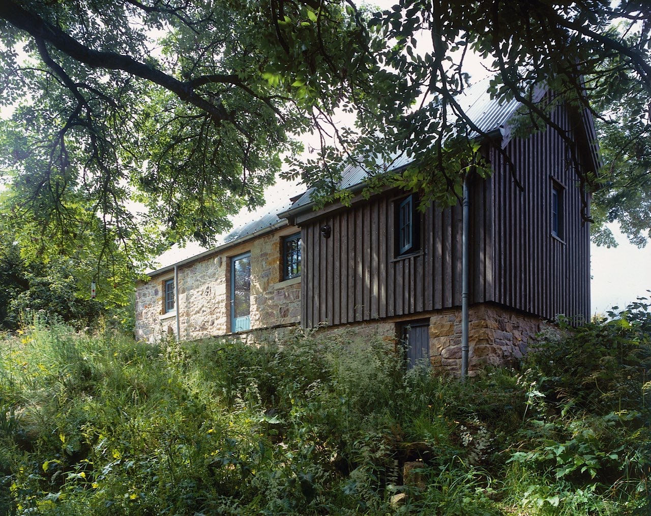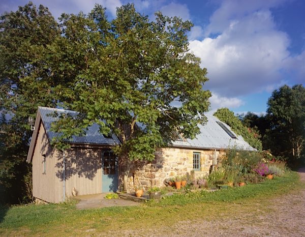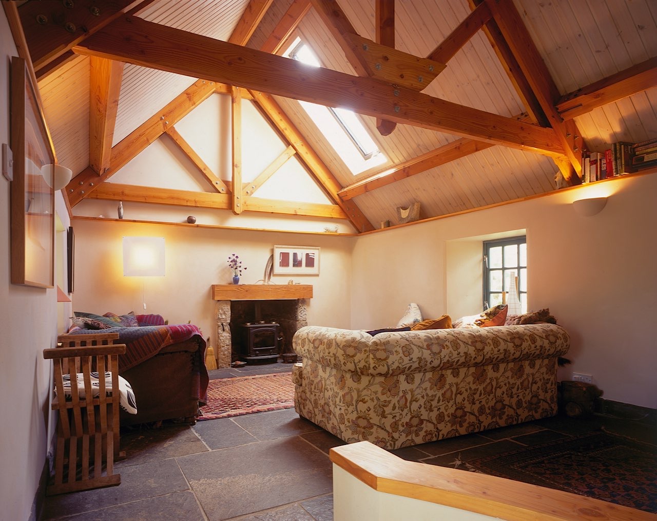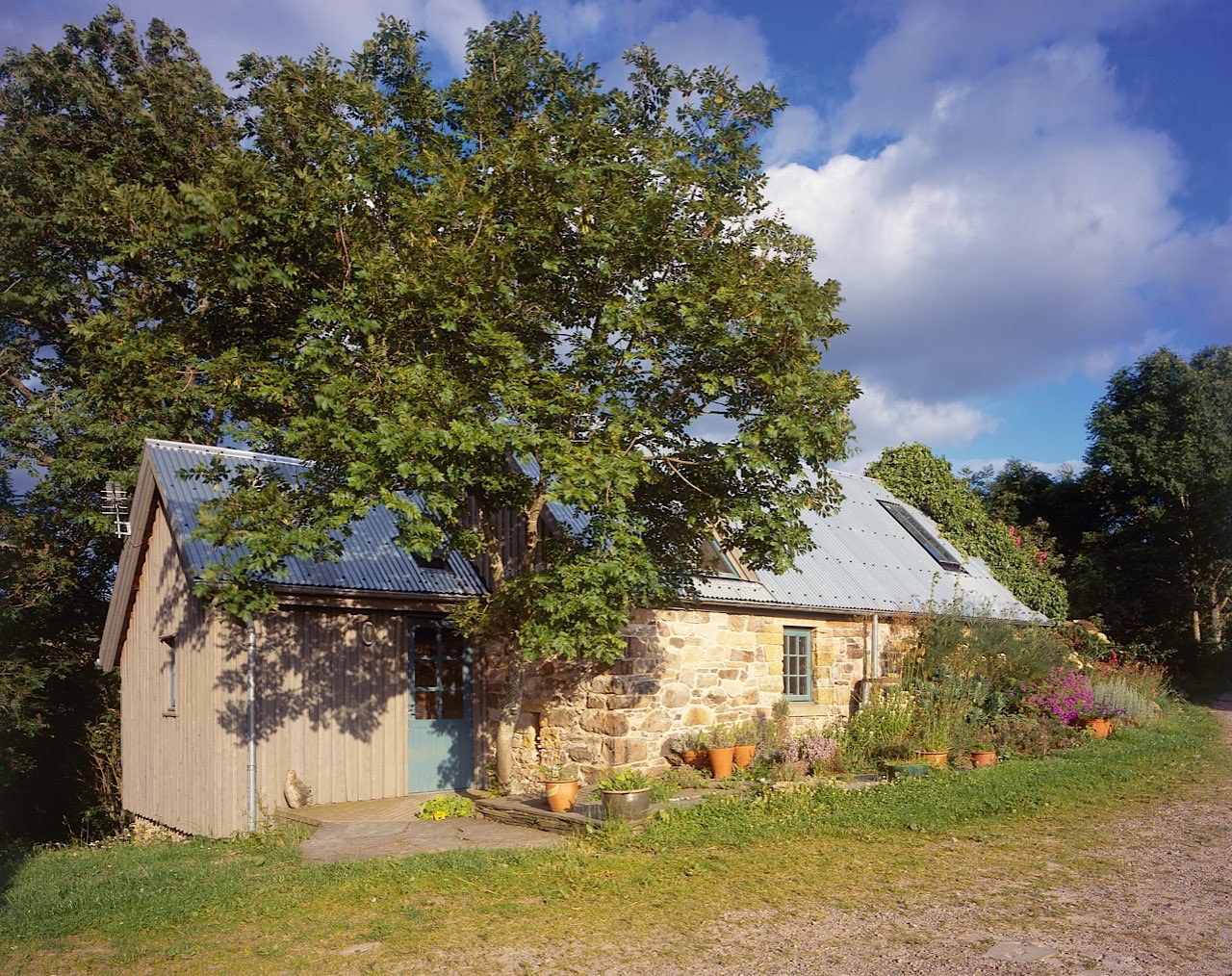 Part of a group of farm buildings, this modern living space was created from the ruins of a tiny bothy. The choice to retain the simplicity and integrity of the original structure led to the addition of a discreet, minimally sized extension offset from the main building. Internally, within the main open plan living space, a douglas fir post and beam structure supports the new roof and contributes to a design that feels much more generous than its actual footprint of 43 square metres.