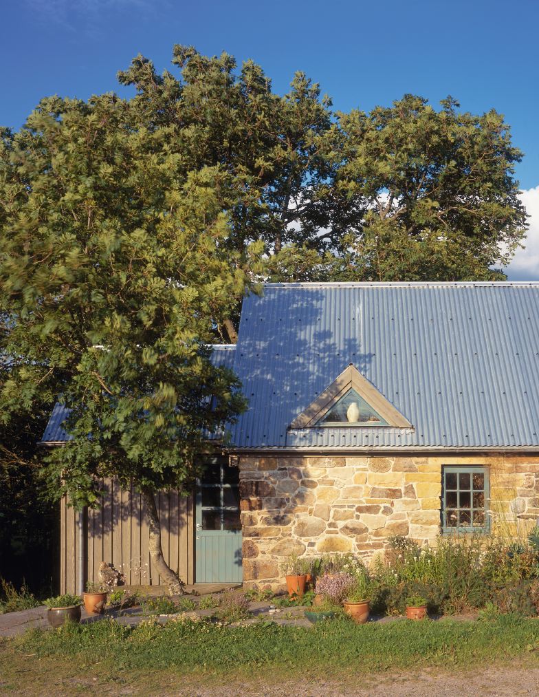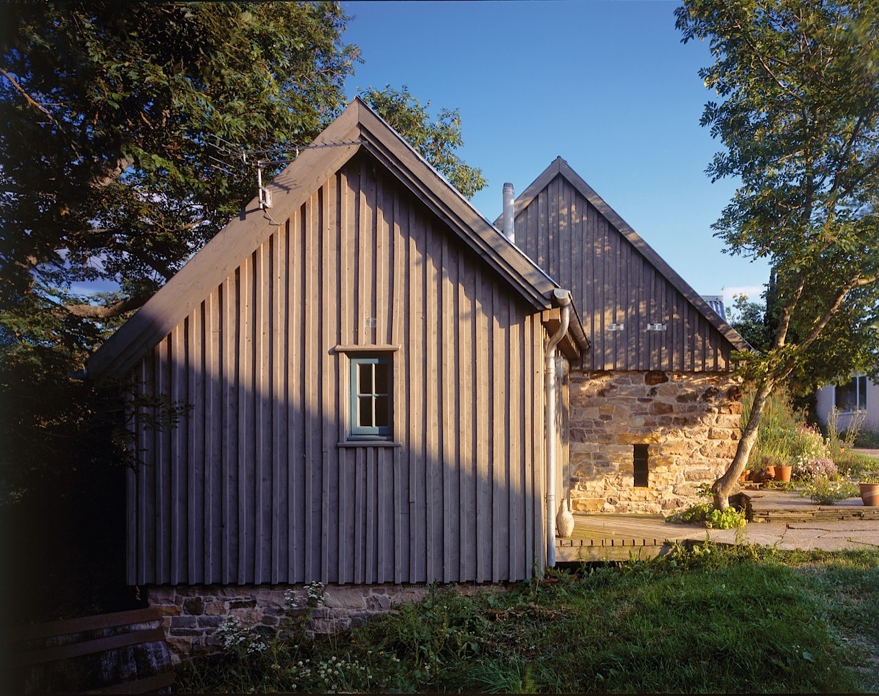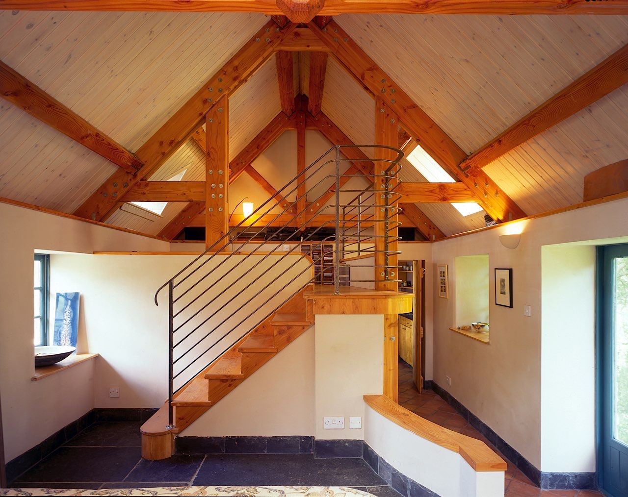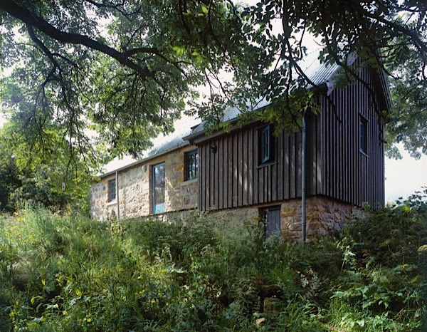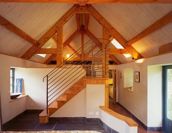 Part of a group of farm buildings, this modern living space was created from the ruins of a tiny bothy. The choice to retain the simplicity and integrity of the original structure led to the addition of a discreet, minimally sized extension offset from the main building. Internally, within the main open plan living space, a douglas fir post and beam structure supports the new roof and contributes to a design that feels much more generous than its actual footprint of 43 square metres.